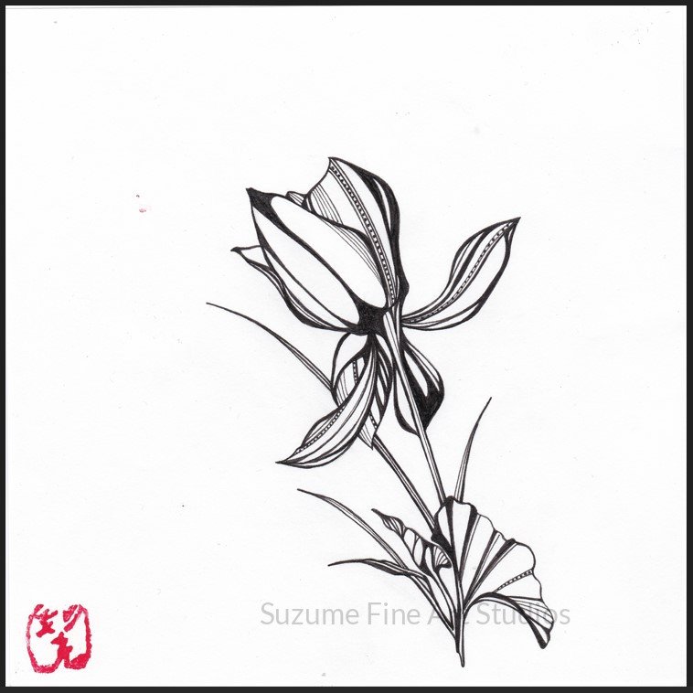 One of the most deeply symbolic flowers in Japanese culture, the Hasu 蓮 (Lotus) denotes enlightenment, purity, and the cycles of life and renewal. The bud, in its unfolding, speaks to the potential for spiritual growth which is beginning to manifest.